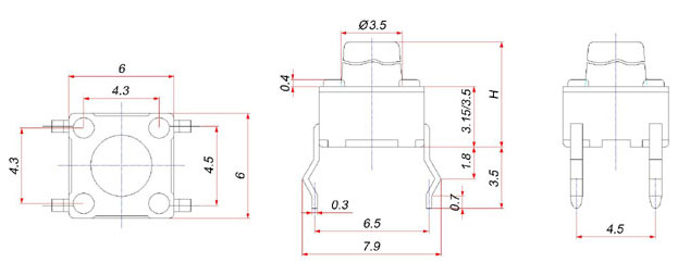 |  | | 型號規(guī)格:TS66H系列 | 中文命名:6*6插腳型輕觸 |